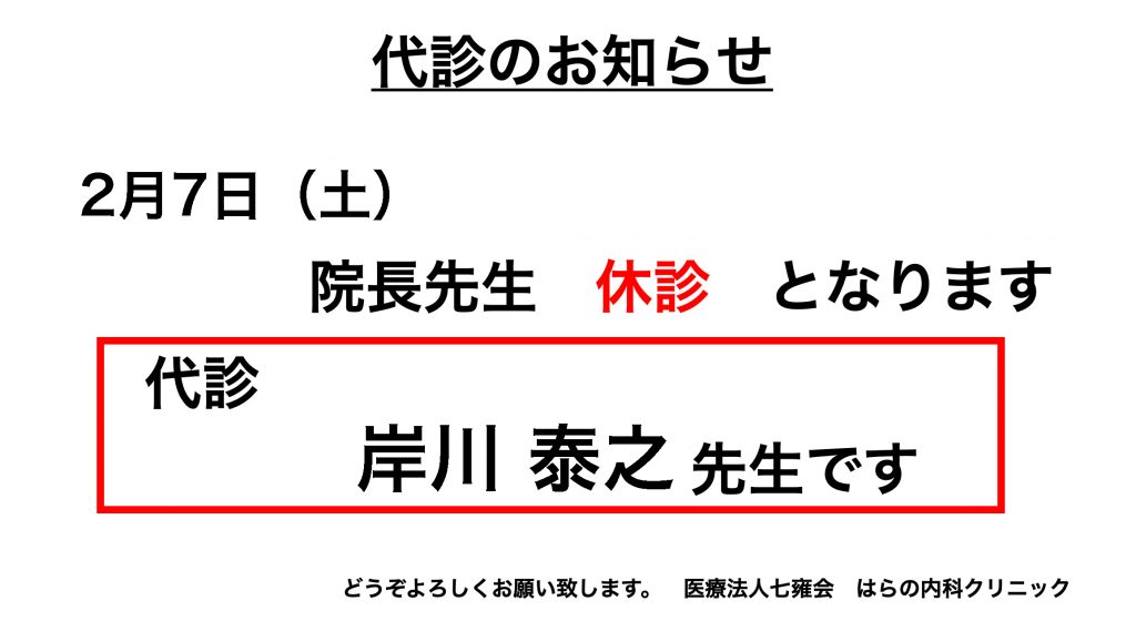 2月7日(土)、は、原野院長が休診となり、代診として岸川泰之先生が診療いたします。